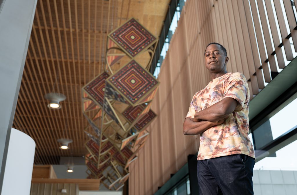 Now on view, a solo exhibition featuring artist Sanford Biggers who was commissioned for the large-scale suspended sculptures titled Odyssey hanging in the North and South ends of the TCORE Concourse Connector. This exhibition highlights Sanford’s multi-media artistic practice and gives an in-depth view into the materials, inspiration points, and work that went into creating Odyssey. This exhibition will be on view through March 2026 in the mezzanine Art Gallery, open Monday-Sunday between 9am-10pm (this is a pre-security area so you do not need a ticket to visit).