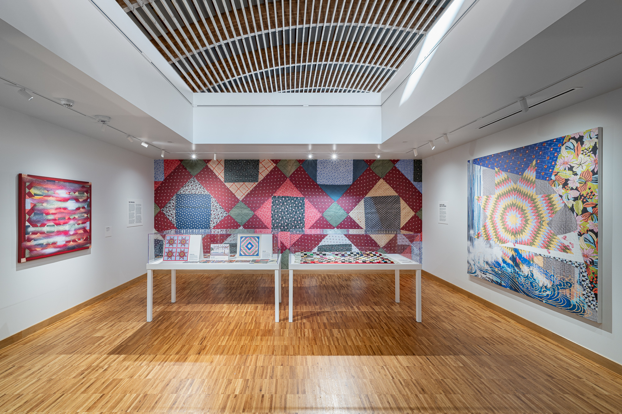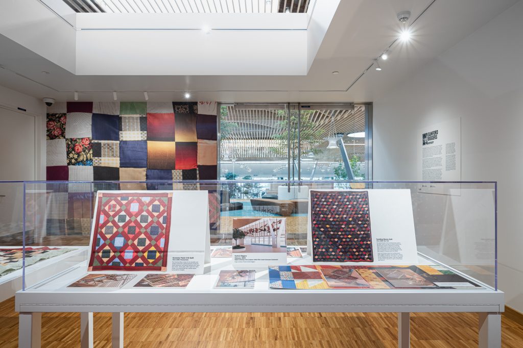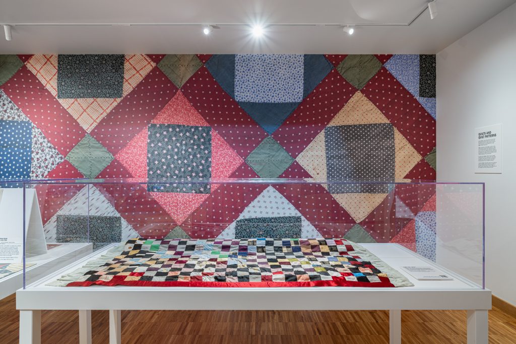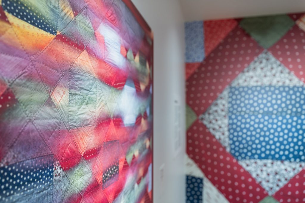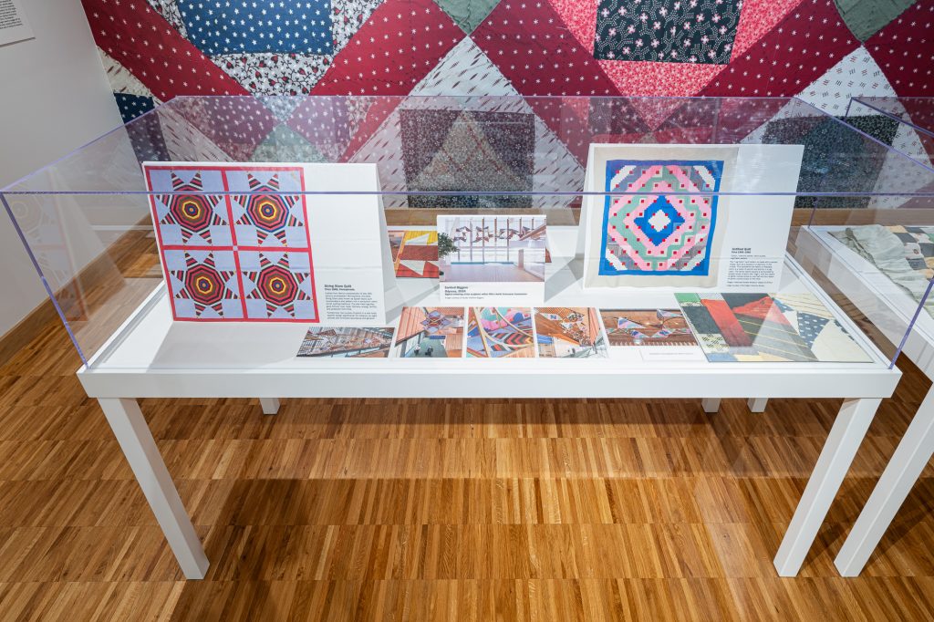 Odyssey features references to several antique quilts sourced from the Oregon Historical Society, including quilts brought along the Oregon Trail by new immigrants to the region. By engaging with these historic local elements, Biggers helps viewers establish a sense of place in a transient environment, as well as inviting new interpretations of the past. The Oregon Historical Society graciously lent one of these quilts to be displayed in the gallery.