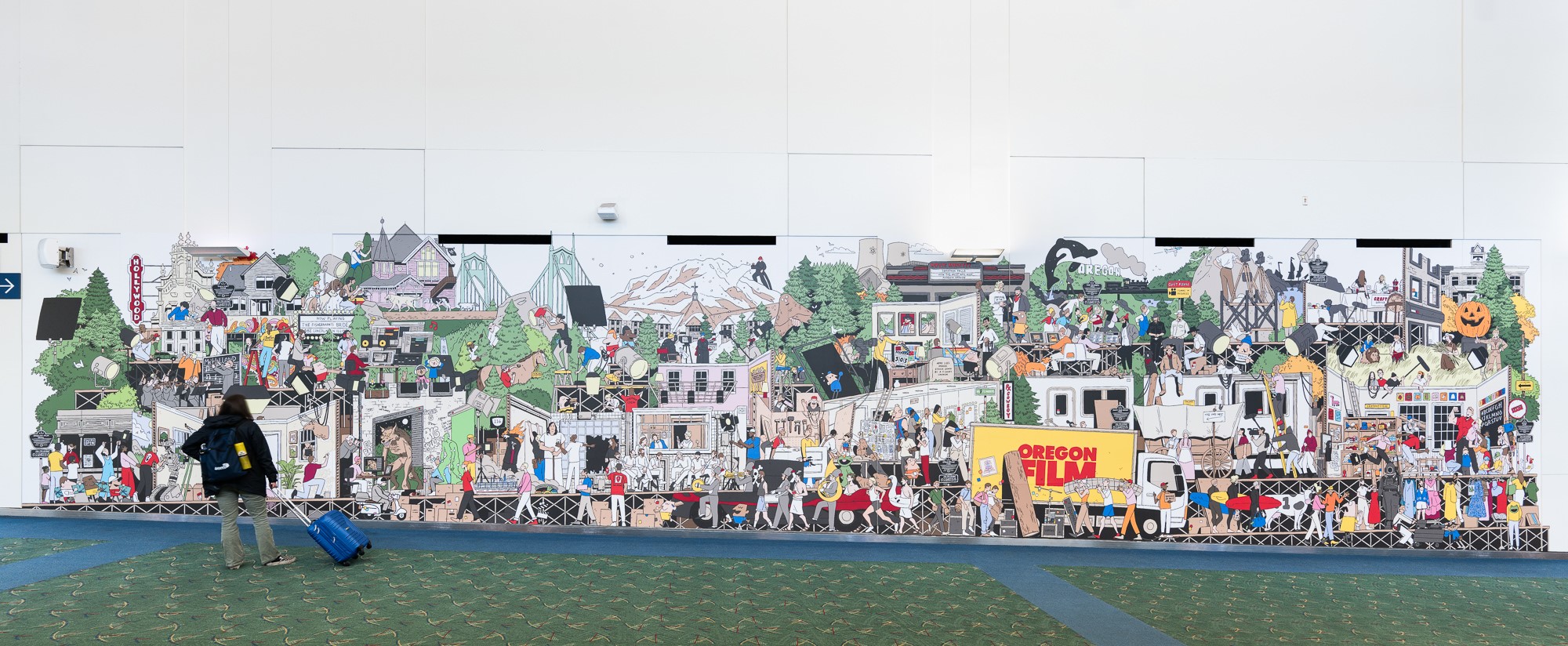 This mural at PDX connects to the Oregon Film Trail, Oregon’s official statewide film trail, which is the first of its kind in the United States. Many locations featured in the mural can be explored on the Trail using SetJetters, Oregon Film’s partner app for finding and visiting real filming locations.